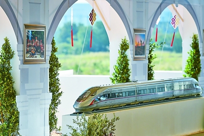 在開工儀式上展出的中國“復(fù)興號(hào)”高鐵列車模型。新華社發(fā)